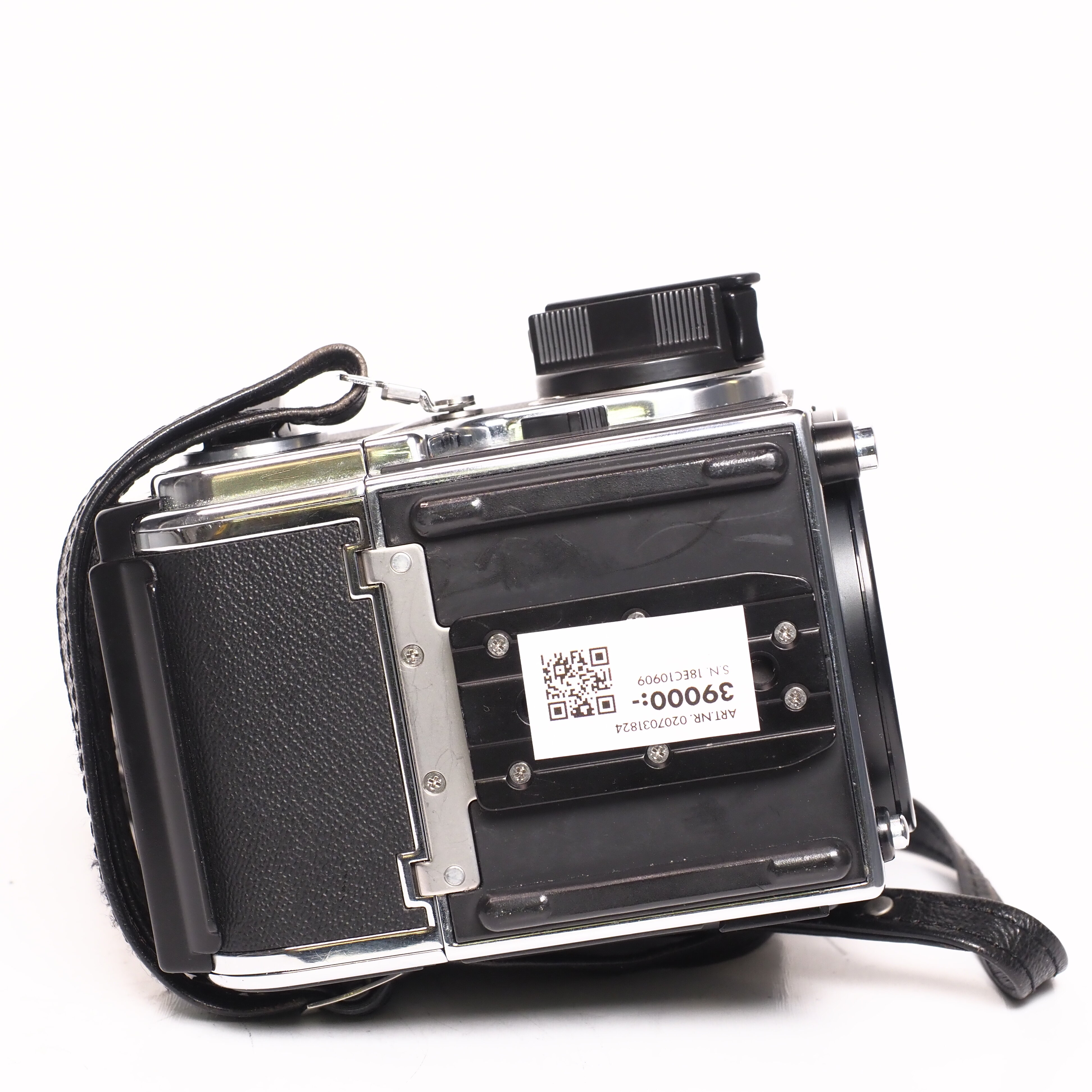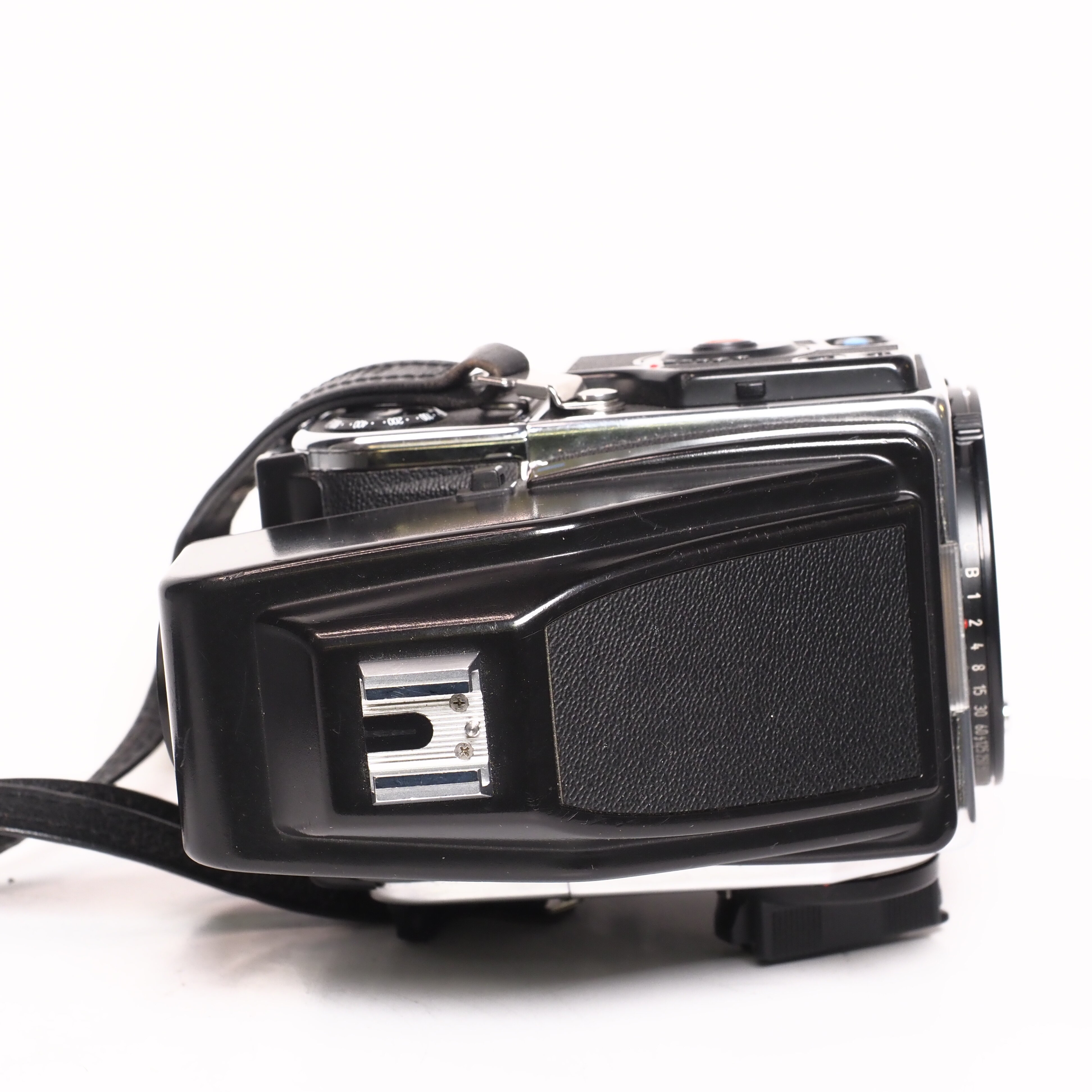 Begagnad analog mellanformatskamera i mycket fint skick (3). Kameran levereras med kamerahuslock PME 90 sökare och E12 bakstycke samt kamerarem.