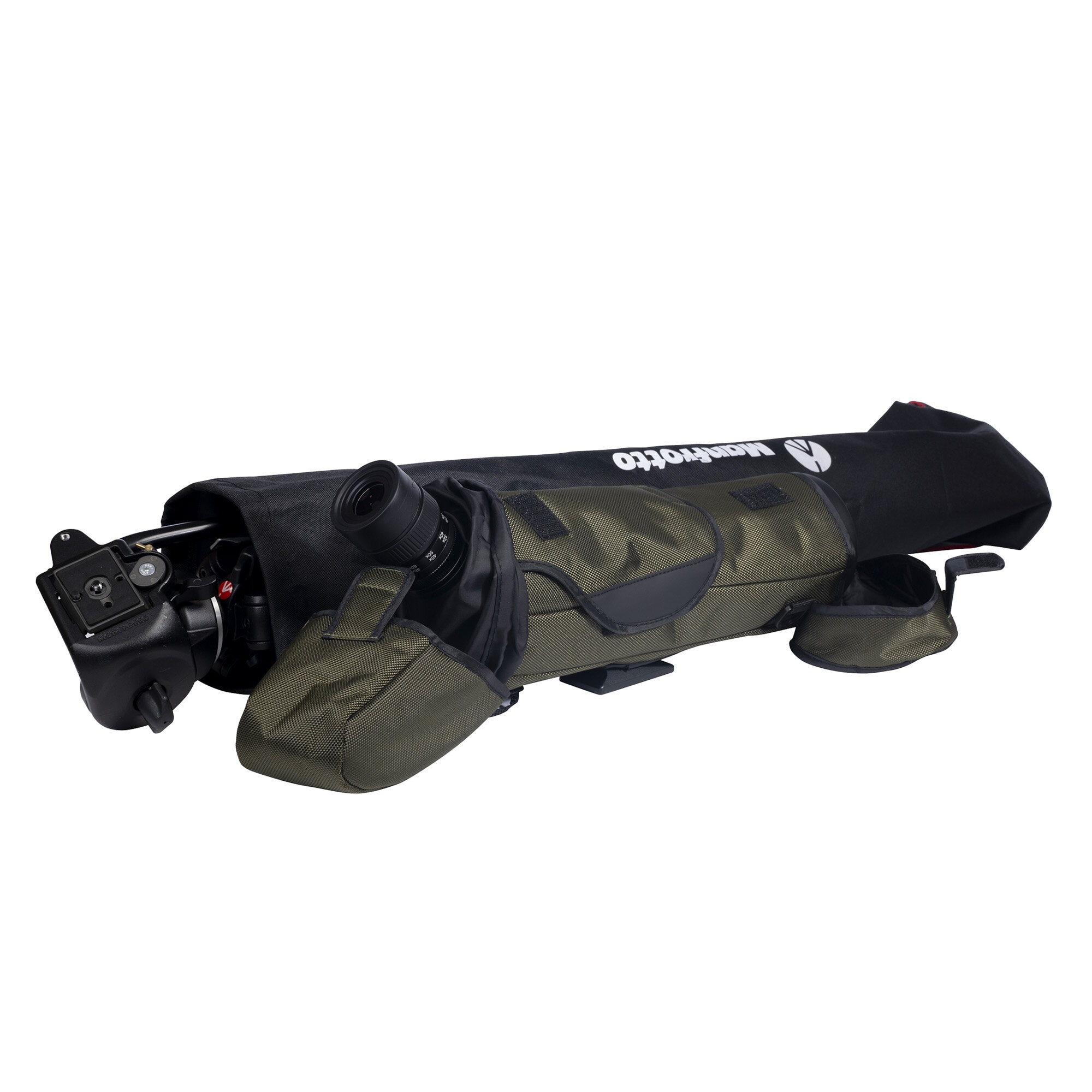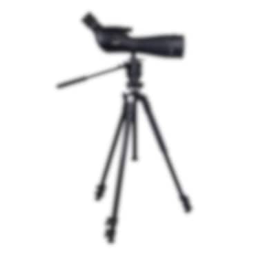 Detta paketet inkluderar ett kraftigt stativ från Manfrotto, ett 3-sektioners stativ i aluminium med en rejäl, gjuten ben-infästning som ger mycket bra stabilitet, hållbarhet och prestanda. Gummerade benvärmare för bekvämt grepp. Maxhöjden är hela 169,5 cm trots att det bara är 69,5 cm hopfällt. Stativet levereras med axelväska. Videohuvudet är silikon-dämpat och är perfekt lämpat för tubkikare, just för att få mjuka och följsamma rörelser i både höjd och sidled. Det har också snabbplatta för enkel och snabb montering av tubkikaren på stativet.