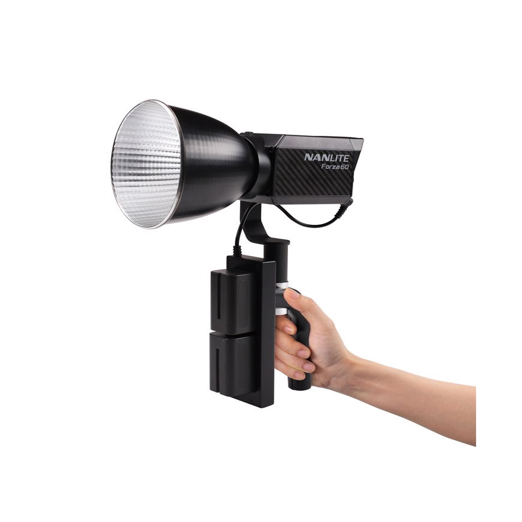 Batterihandtaget kan monteras på ett ljusstativ när du vill driva din Nanlite Forza 60 från NP-F-batterier.