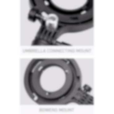 Bowens monteringsadapter för Forza 60 har också ett paraplystångfäste för att använda paraplyreflektorer och diffusorer.