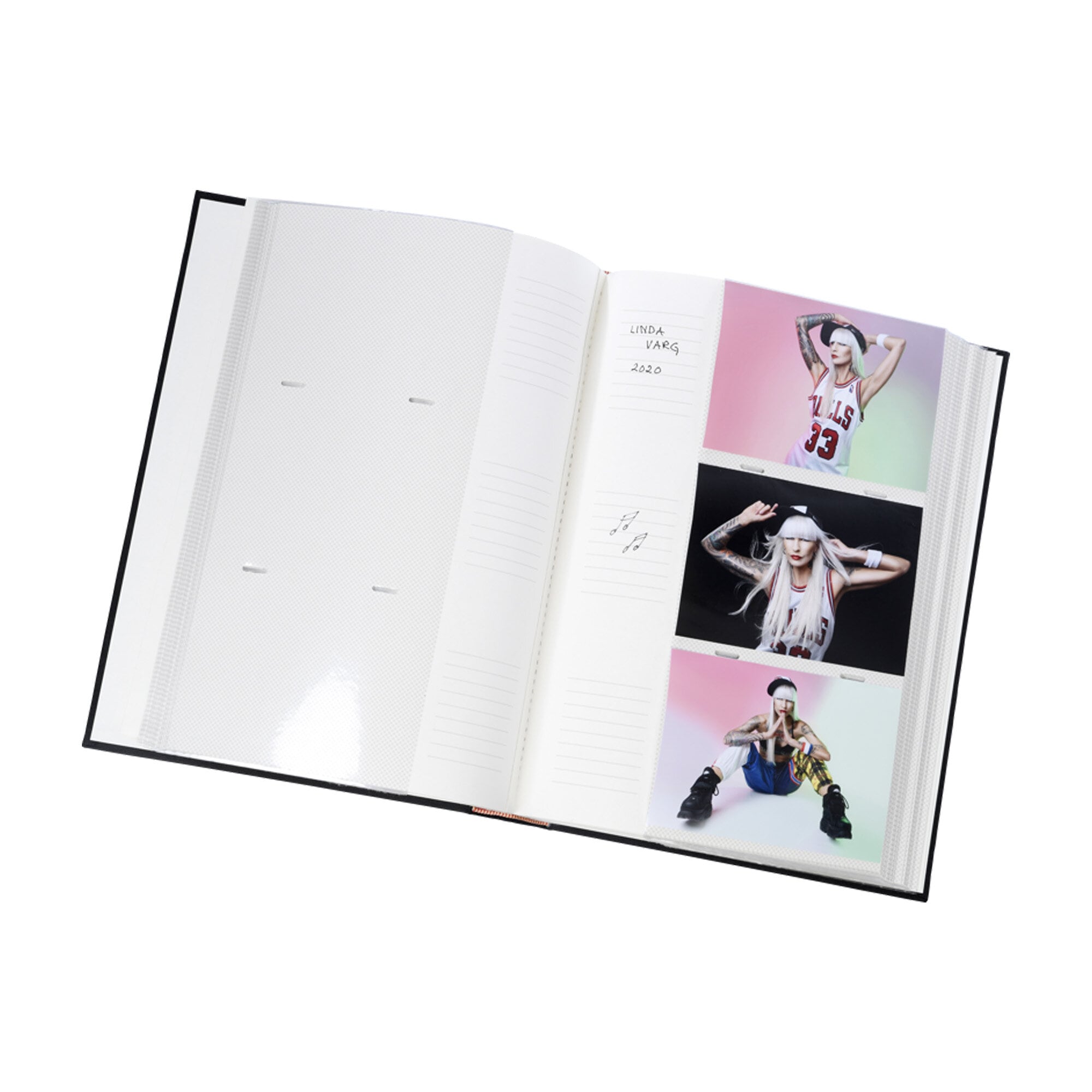 Inuti hittar du fickor för 300 bilder och skrivutrymme för enkel personalisering.