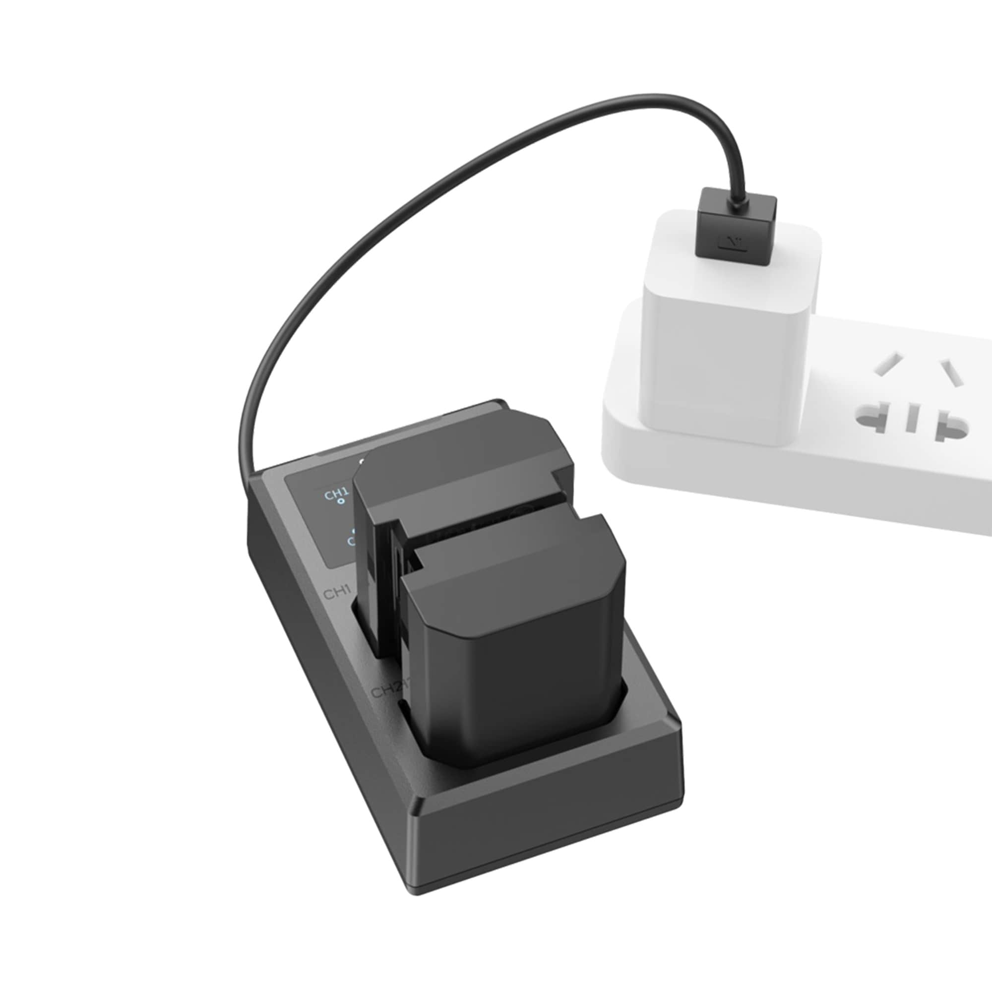 Kit med Laddare & 2st batterier Det är i samma storlek som originalbatteriet och passar därför perfekt i batterifacket. Den dubbla batteriladdaren kan ladda två batterier samtidigt, och dess LCD-skärm visar laddningsstatus i realtid. Den har USB-A Laddkabel och USB-C-gränssnitt, så att den kan laddas via USB-adapter, billaddare, powerbank.
