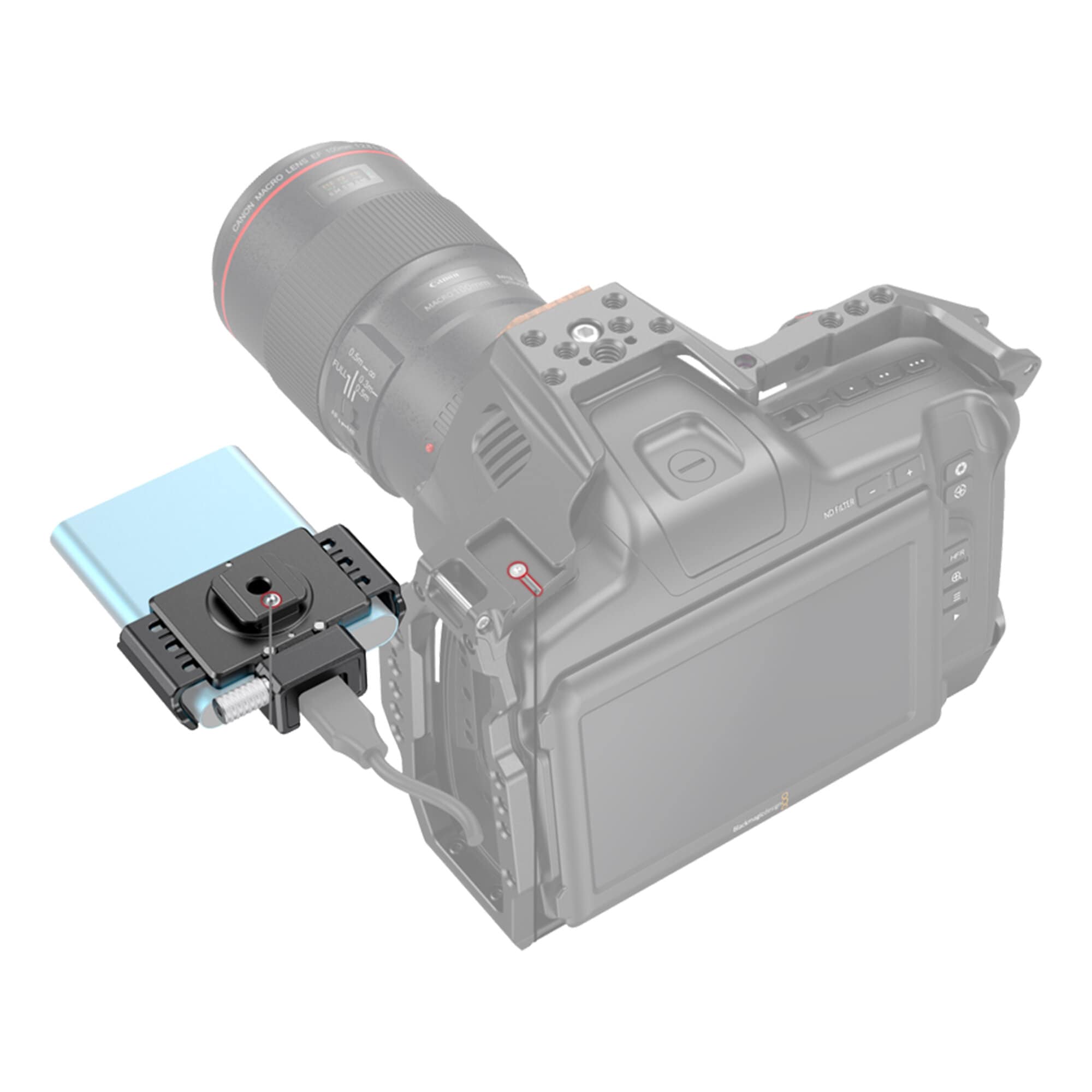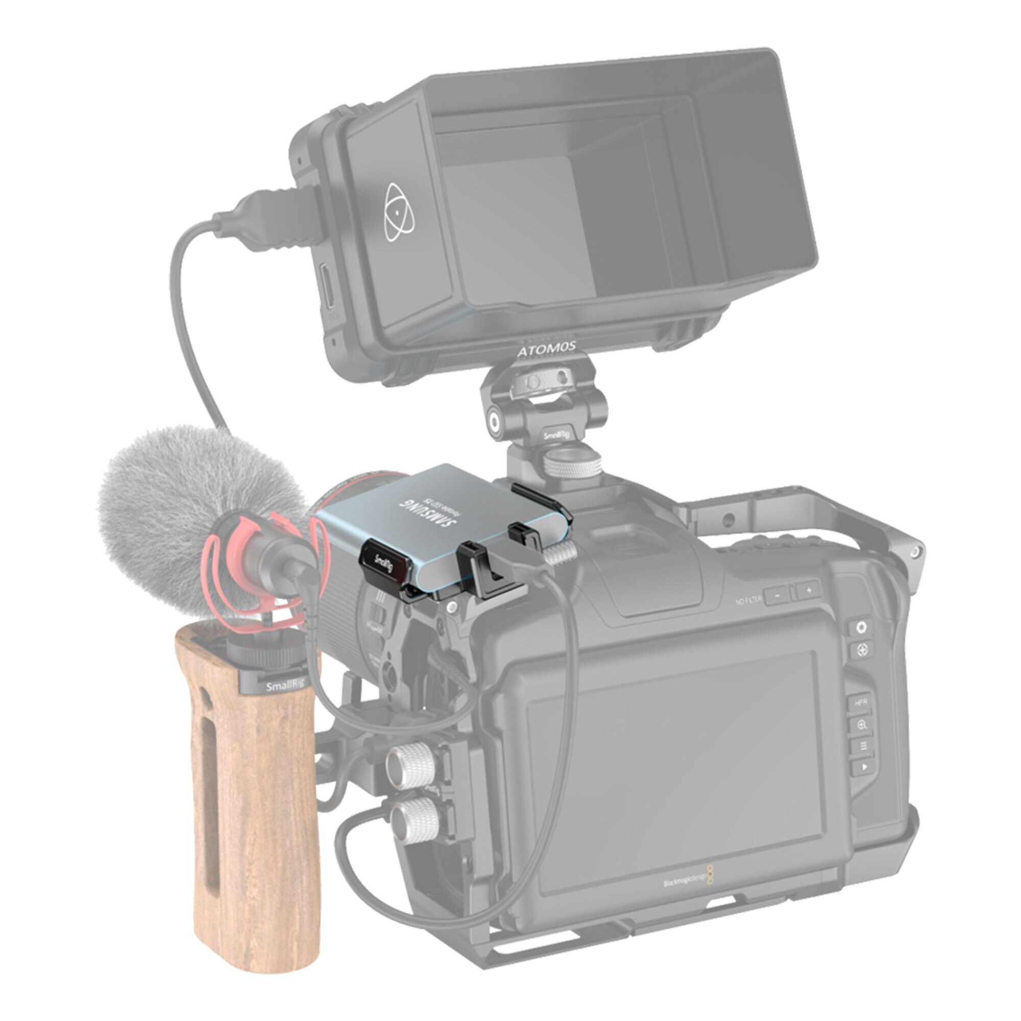 Fästet fungerar som en ljudinstallation för en BMPCC 6K PRO-kamera med SSD.