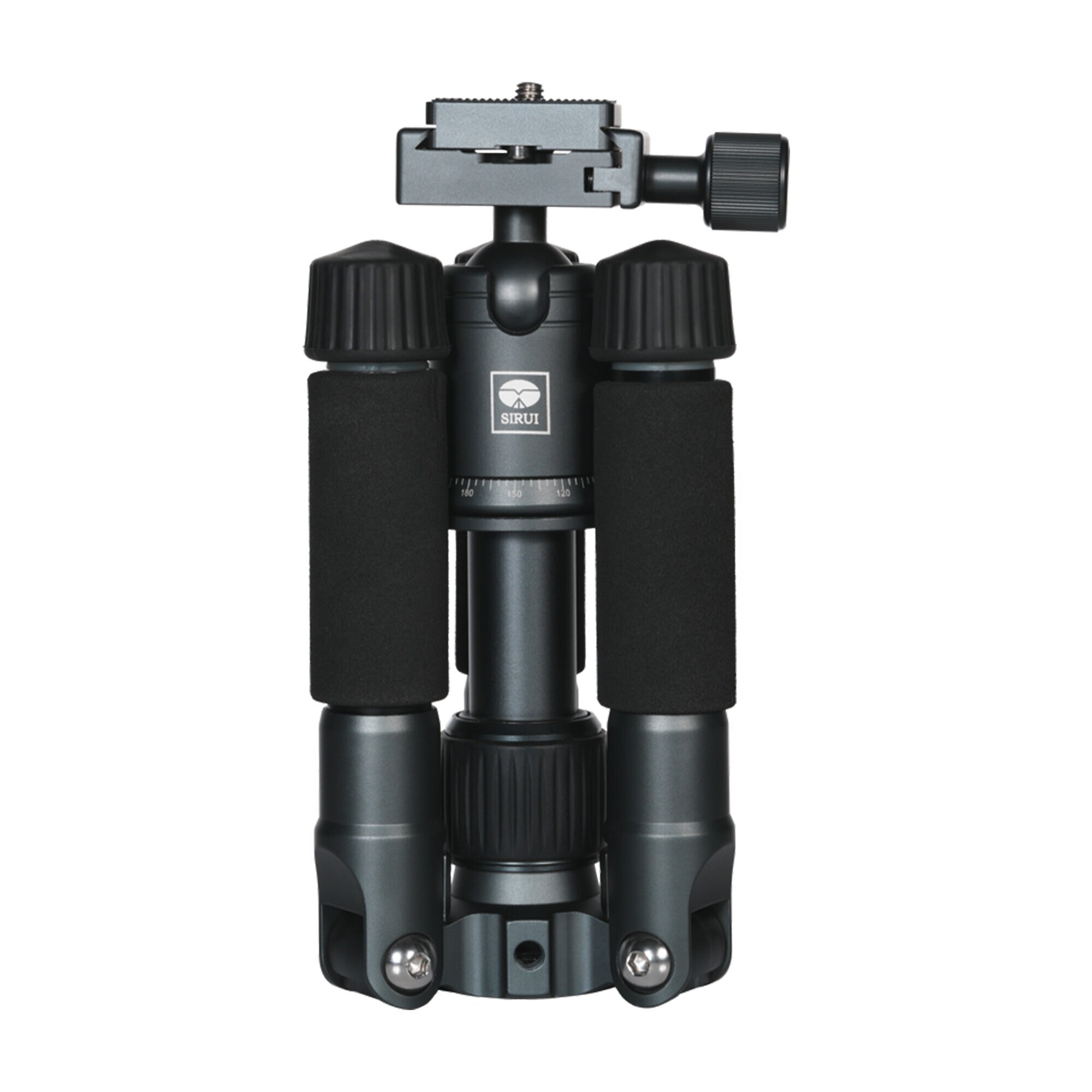 De gummerade fötterna ger ett bra halkskydd, vilket säkerställer stabilitet under användning. Det finns även flera 1/4”- och 3/8”-gängade hål för att montera olika tillbehör. Stativet har ett kulhuvud med snabbkopplingsplatta och en panoreringsfunktion för bättre flexibilitet.