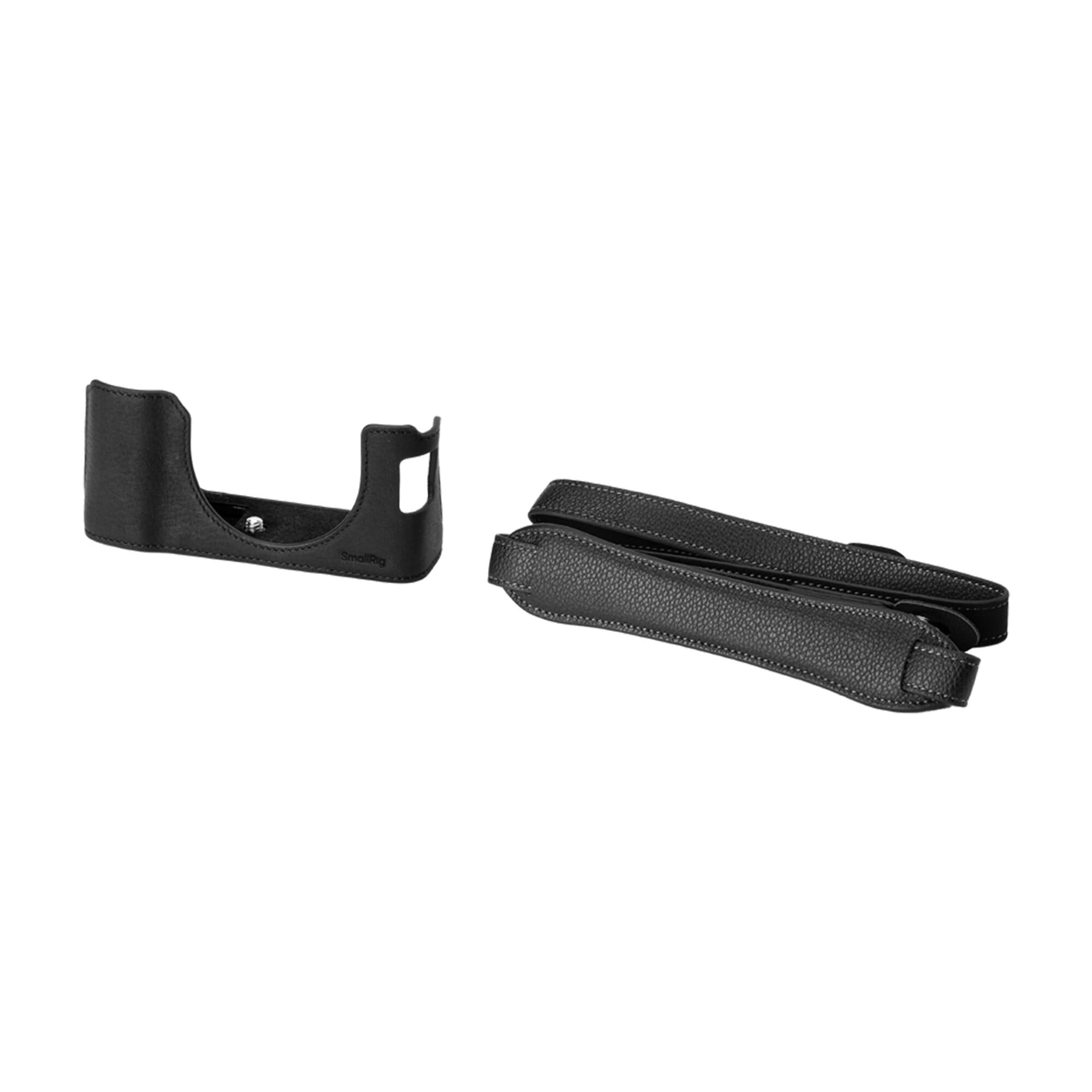 Ett svart kit från Smallrig som innehåller både ett halvfodral och en rem deisgnat för Fujifilm X100VI. Halvfodralet är tillverkat i slitstark läder och monteras fast med en inbyggd 1/4"-20 tumskruv. Fodralet är utformat för att ge åtkomst till kameran viktigaste funktioner, såsom batterilucka och kortplats.